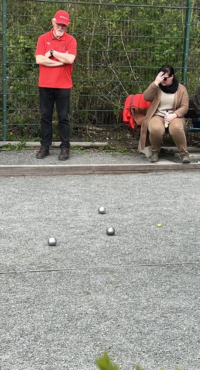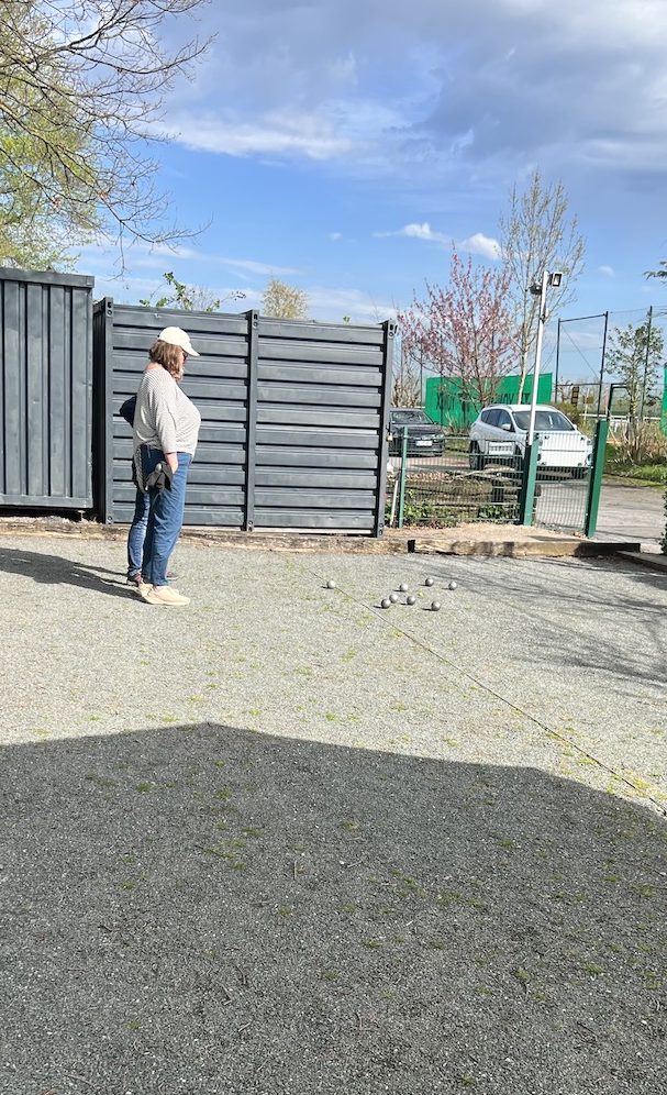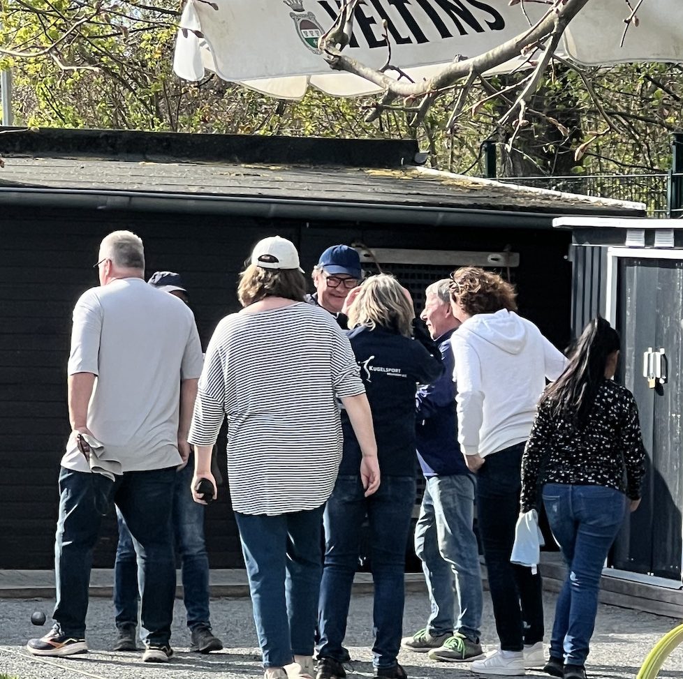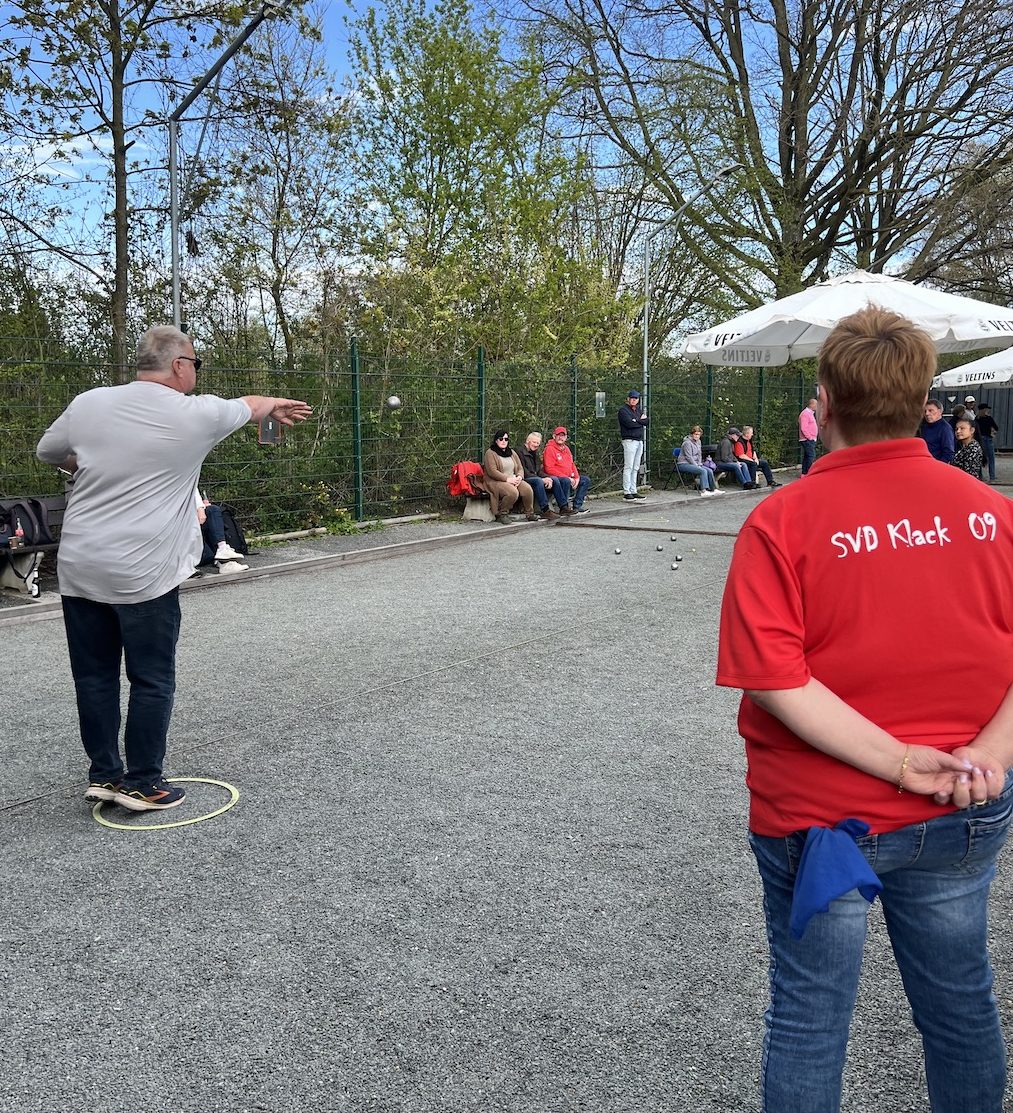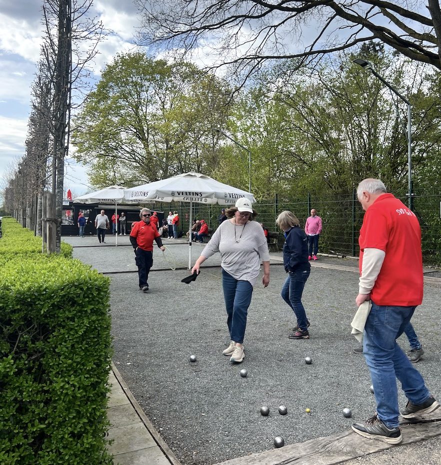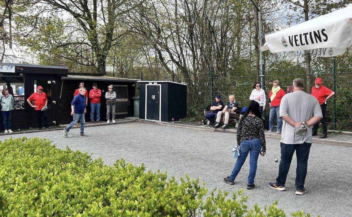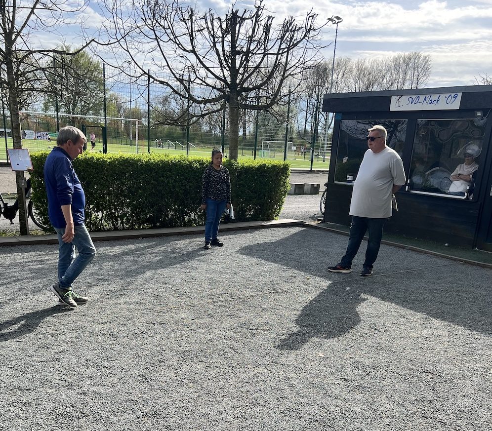Bei Sonne, Wolken und Wind wurden im schönen Boulodrom des SV Klack 09 zunächst drei Tête-à-tête gewonnen (also auch drei verloren…) und anschließend alle drei Doubletten gewonnen, so dass die Aufgabe für die Tripletten darin bestand, wenigstens eines zu gewinnen. Das erste Triplette ging dank der hervorragenden Legeleistung des Drensteinfurter Teams verloren. (Fünf Kugeln auf dem Durchmesser der berühmten „Tortenplatte“, trotz zweier guter Verteidigungskugeln zwanzig Zentimeter vor der Sau, beendeten das Spiel bei einem Spielstand von 5:8.)